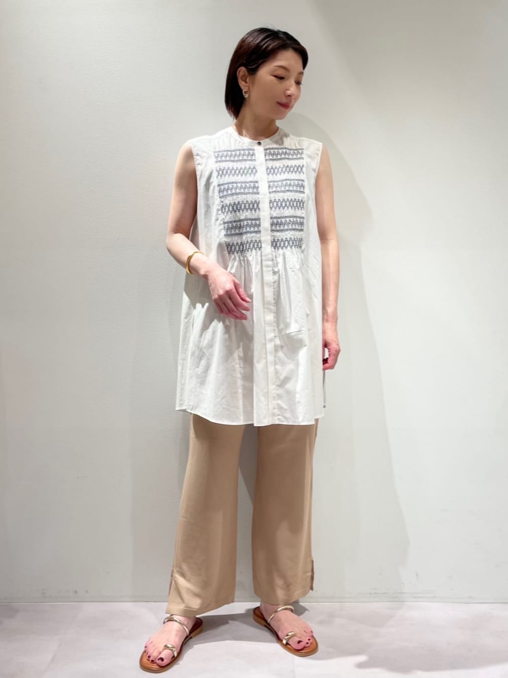 KAWAMURA(カリテ エスパル仙台東館店)のタンクトップ「スモッキングチュニックシャツ/夏服/オフィスカジュアル/ノースリーブトップス」を使ったコーディネート