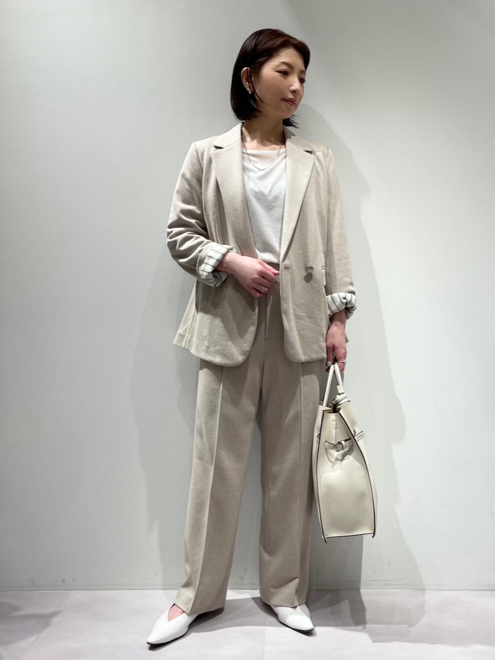 【◇冬物新作◇ ツイルジャージSET UPコーデ♪】 【ジャケット】 着用サイズ:36サイズ ▼サイズ感 肩幅広めの体型ですが、36サイズでも程よくゆったり着られました! 丈はヒップが隠れるくらいの着丈です✨ ▼着心地・生地感 袖の裏地はストライプなので、折り返すとポイントになります^_^ ウール混のジャージ素材で、軽くて暖かくストレスフリーな着心地✨ 手洗い可能なのも嬉しいポイントです♪ ▼コメント インナーにトレンド感のあるベロアロンTを合わせました♪ ボトムをデニムに変えてカジュアルなスタイルもおすすめです^_^ 【パンツ】 着用サイズ:36サイズ ▼サイズ感 36.38.40サイズの3サイズ展開。 ウエストゴムでゆったりめのシルエットですので、36サイズで丈感もちょうど良く穿けました^_^ ▼着心地・生地感 ウール混のジャージ素材で、伸縮性がありとても柔らかな穿き心地✨ ウエストゴム&紐、前ファスナーで着脱もしやすいです‼︎ ピンタックで縦長に見えるシルエットで、オンオフ穿いていただけます♪ ▼コメント 同素材のジャケットで合わせたセットアップコーデは、きちんとしたシーンにも◎♪ ストレスフリーで穿けるパンツは、カジュアルなコーディネートにもおすすめですよ^_^