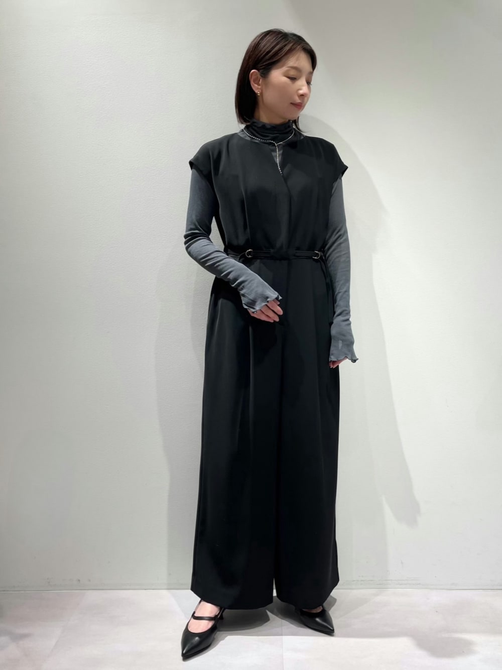 【ワンピース】 着用サイズ:34サイズ ▼サイズ感 34sizeと38sizeの2サイズ展開。 34size着用で着丈が短くなり過ぎず、すっきりしたシルエットで着れました♪ 着脱の際は、フロント開きのスナップボタンで留められるので、着脱がとても楽です^_^ ▼着心地・生地感 膨らみのある上品な生地感で、軽くてサラッとした肌触り✨ カジュアルな着こなしからオケージョンまで幅広く着られる素材感です^_^ 半袖なので、インナーにタートルや羽織りと合わせていただくとオールシーズン着回しできます‼︎ ウエストの切り替えしのゴールドのD管ベルトがポイントで、ウエストにメリハリが出ます。 ヒップ部分にもポケットが付いているので、バックスタイルも安心♪ シワになりにくく手洗い可能。 ▼コメント インナーにシアー感のあるタートルを合わせたパーティーシーンでも着られる綺麗めスタイル✨ 畳みシワや座りシワが気になりにくい素材なので、ご旅行などにもおすすめのオールインワン♡ サイドポケット付きで、フロント開きで着脱もし易いので、お出かけにも大活躍しますよ^_^ 【タートル】 着用サイズ:Fサイズ ▼サイズ感 インナーに着易いコンパクトサイズです。 着丈や袖丈が長く、生地端のメロウ仕様や袖先のスリットがポイントです。 ▼着心地・生地感 程よい透け感で、重ね着に使いやすいアイテム♡肌触りも良く着心地が良いです^_^ ▼コメント 程よいシアー感があるので、インナーにも使いアイテム✨パーティーシーンにもおすすめです♪