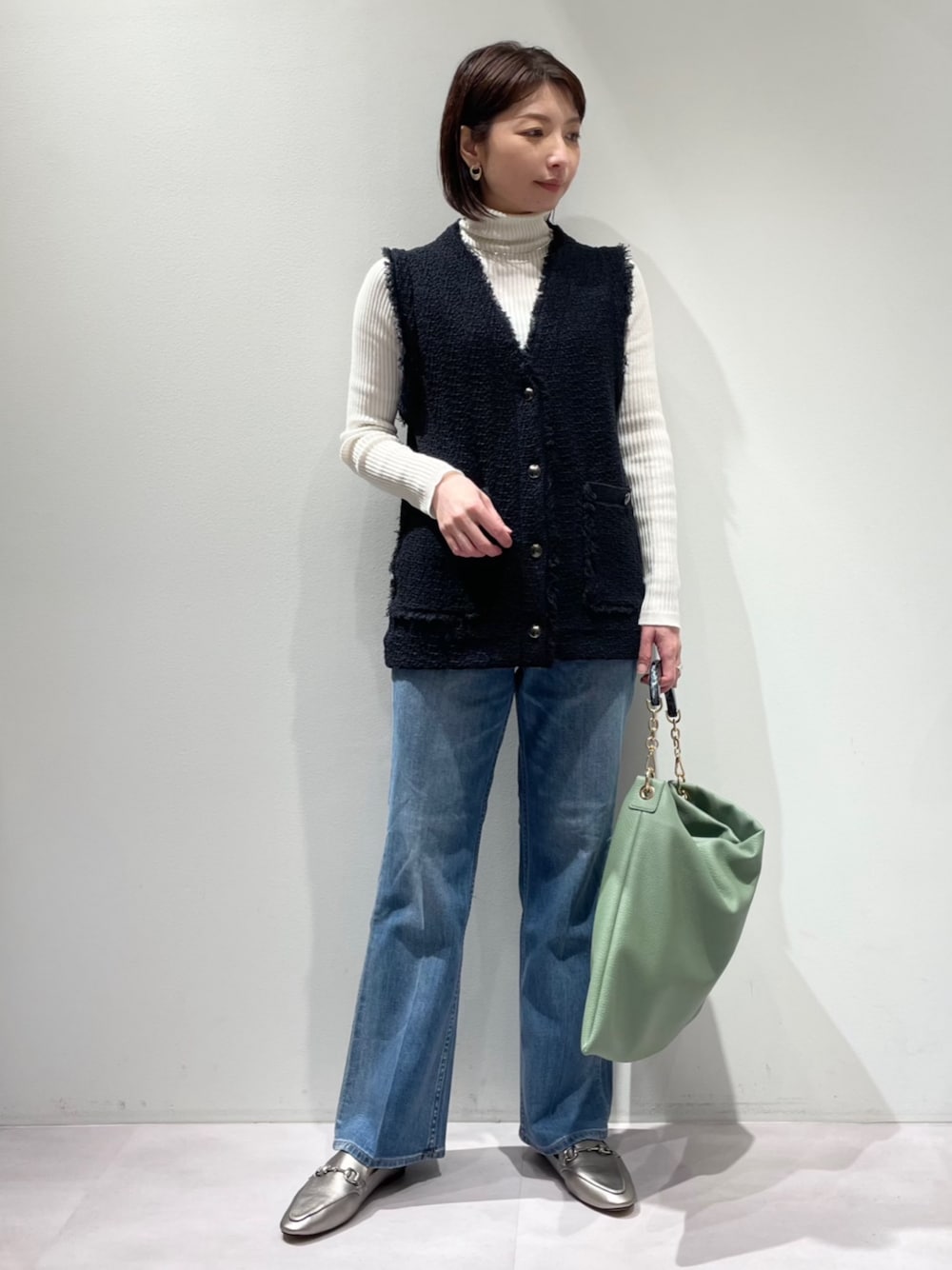 【トップス】 着用サイズ:38サイズ ▼サイズ感 肩幅が少し小さめのデザインで、肩幅広めな体型でもすっきりと着られました! 着丈が長めで縦長効果があります✨ ▼着心地・生地感 ミックスカラーの糸で編まれたツィードニット。メタリックボタンがポイントです^_^ きちんと感があるので、ブラウスと合わせたオケージョンやオフィスシーンにも◎ ⭐︎手洗い可能⭐︎ ▼コメント 今回はデニムやタートルニットと合わせてデイリーに着られる大人カジュアルコーデに合わせました♪ 【ボトム】 着用サイズ:36サイズ ▼サイズ感 ウエスト位置が高めで、ストレッチがきいていて柔らかい穿き心地♪ 丈も長すぎず、ちょうど良いサイズ感です^_^ ▼着心地・生地感 ストレッチで伸びがあるので、ジャストサイズでお選びいただくと程よいサイズ感に馴染みます。 ▼コメント 【Healthy Denim】 フレアシルエットの「Lotus(ロータス)」。 カラー : ブルーのみ。 サイズ : 32、34、36、38sizeの4サイズ展開。 フレアシルエットとセンタープレスで足長効果◎✨腰位置が高く見え、横のラインがとても綺麗なデニムです^_^