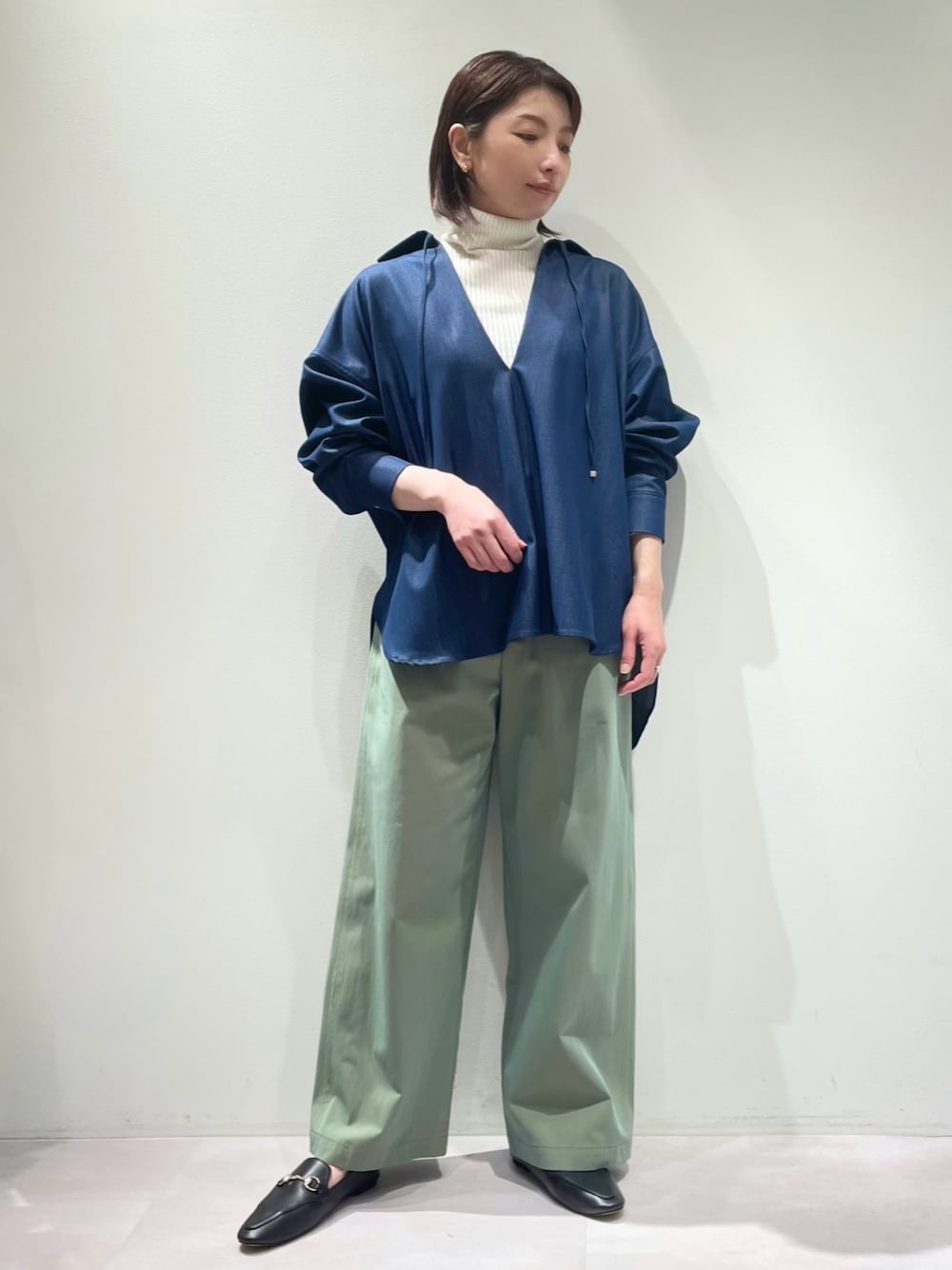 【トップス】 着用サイズ:Fサイズ ▼サイズ感 スキッパーデザインや後ろのスリットで抜け感があり、オーバーサイズでゆったりと着られます♪ 前後差のある丈感で、後ろは太腿中間くらいまでと長めです! ▼着心地・生地感 薄手のデニム生地を使っており、柔らかくて軽いので、着心地がとても良いです✨ ▼コメント インナーにニットタートルを合わせていただくと、冬の時期からスタイリングを楽しんでいただけます♪ カラーは、インディゴ・ブラックの2色展開です。 【ボトム】 着用サイズ:38サイズ ▼サイズ感 ハイウエストのストレートワイドシルエットで、後ろウエストゴムとなっております♪ 丈は身長160㎝で、足の甲にかかるくらいです。 ▼着心地・生地感 春らしいシャンブレー生地で、カジュアルなトップスとの相性も良いですよ^_^ さりげない配色ステッチがポイントになっております✨ ▼コメント カラーは、ベージュ・カーキの2色展開。 サイズは、36・38の2サイズ展開。 シャンブレーの光沢感が品良く大人カジュアルなコーディネートを叶えてくれます♪