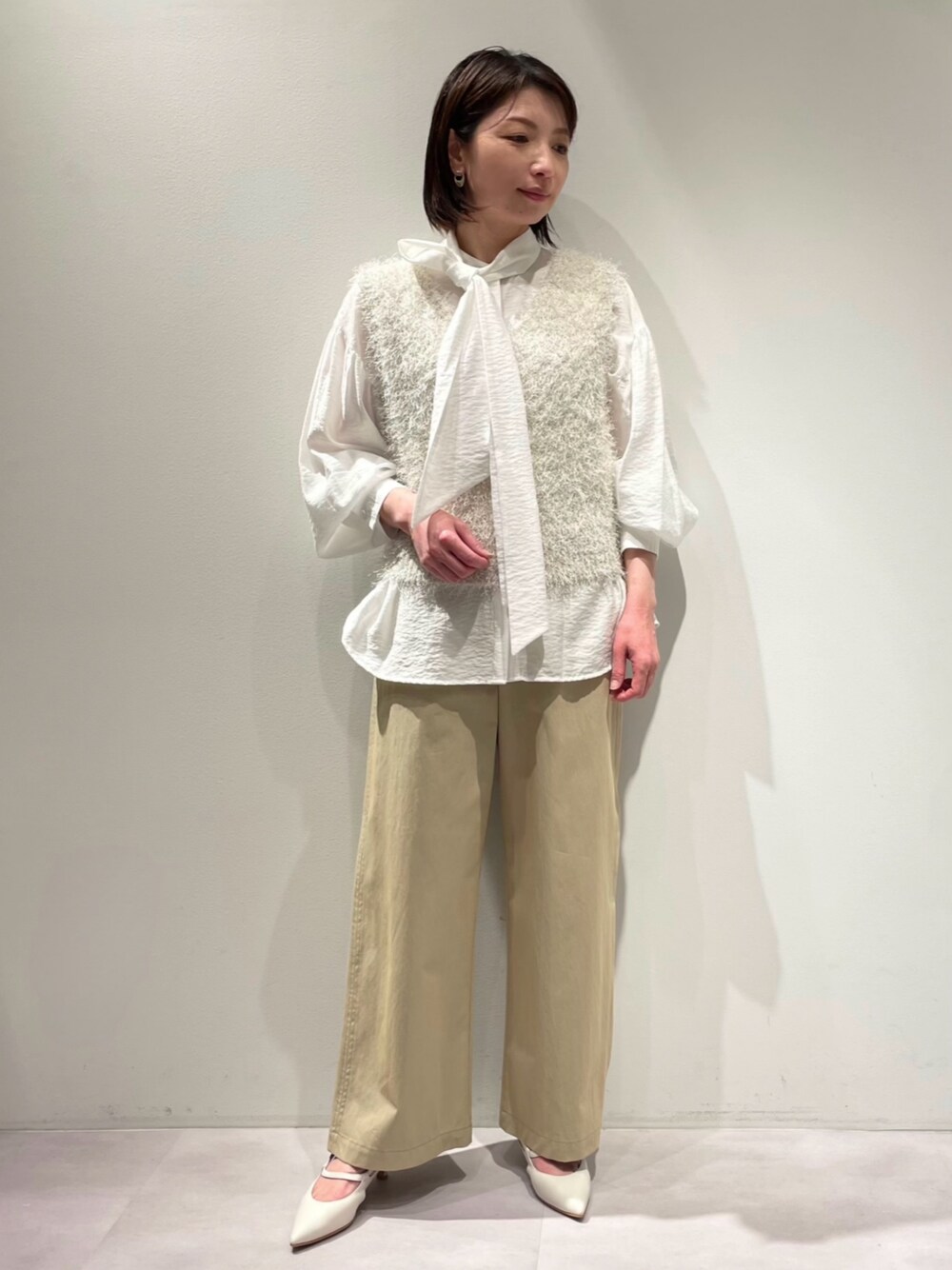 【ブラウス】 着用サイズ:Fサイズ ▼サイズ感 ドロップショルダーでリラックス感のあるゆったりとしたサイズ感♪ 着丈は長めですので、トレンドのショート丈ニットとの重ね着にも活躍します‼︎ ▼着心地・生地感 しわ感のあるシアー素材を使ったボウタイブラウス♡ シアー感は肌が透け過ぎないので安心^_^✨ お仕事スタイルやオケージョンシーンにも合わせていただけます。 ▼コメント カラー展開:ホワイト・ピンク・ブラック。 ニットベストなどのインナー使いに着回しできるので、すぐに着られるアイテムです👍 【ニットベスト】 着用サイズ:Fサイズ ▼サイズ感 着丈は腰丈くらいで、コンパクトめな見た目ですが、とても伸縮性のあるニットを使っていて窮屈感なく着られます✨ ▼着心地・生地感 ラメとシャギーの質感がとても可愛いニットです♪まだまだ寒いこの時期にはリブニットやシャツと重ねると暖かく着ていただけますよ^_^ ⭐︎手洗い可能⭐︎ ▼コメント 仙台店では、オフホワイト・チャコールグレーの2色を取り扱っております。 気温感に合わせてインナーを変えながら春コーデを楽しんでいただけるアイテムです♪ 【ボトム】 着用サイズ:38サイズ ▼サイズ感 ハイウエストのストレートワイドシルエットで、後ろウエストゴムとなっております♪ 丈は身長160㎝で、足の甲にかかるくらいです。 サイズは、36・38sizeの2サイズ展開となっております。 ▼着心地・生地感 春らしいシャンブレー生地で、カジュアルなトップスとの相性も良いですよ^_^ さりげない配色ステッチがポイントになっております✨ ▼コメント カラーは、ベージュ・カーキの2色展開。 シャンブレーの光沢感が品良く大人カジュアルなコーディネートを叶えてくれます♪