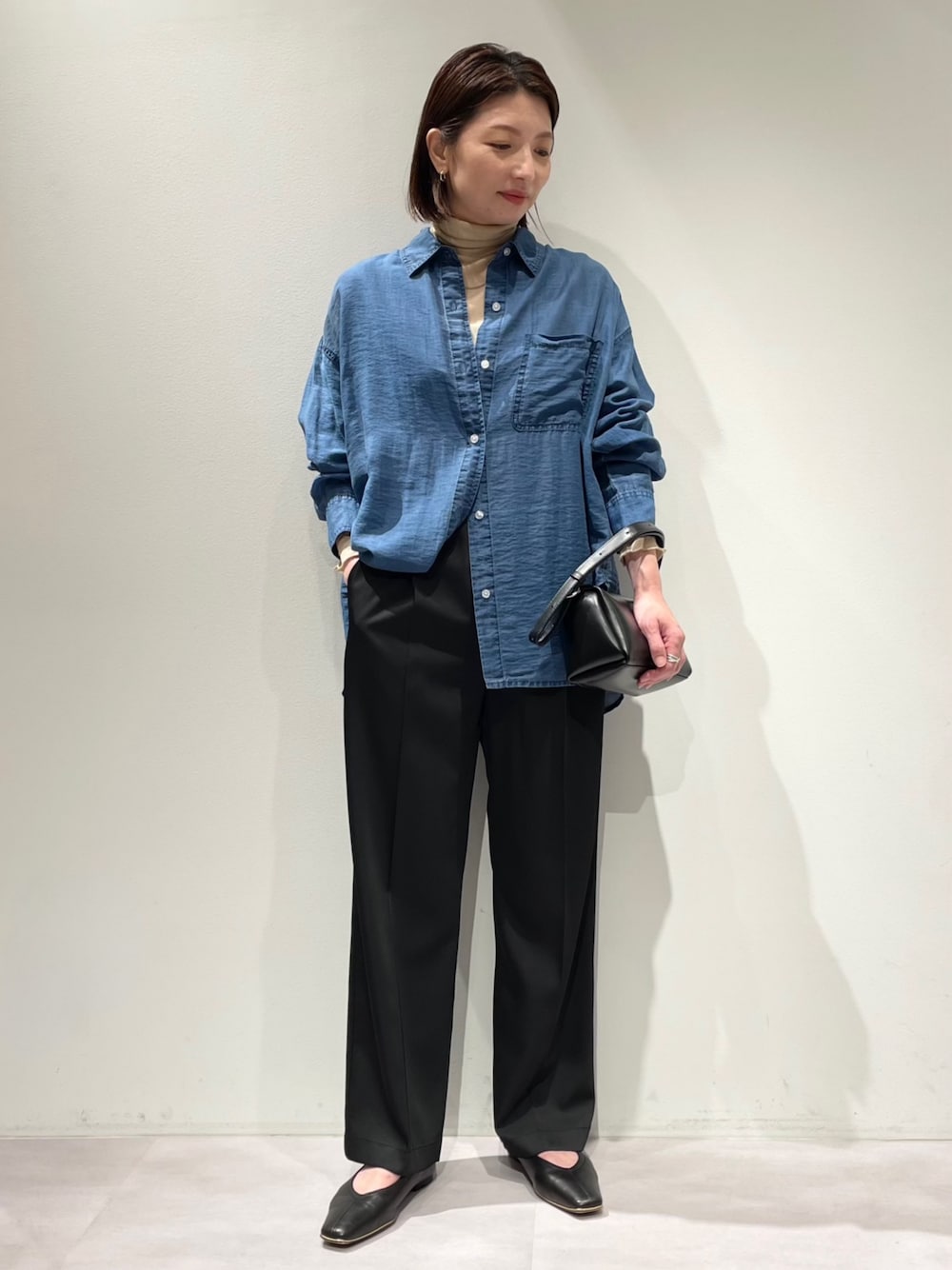 【シャツ】 商品名: 『シアーデニムライクシャツ』 着用サイズ: Fサイズ ▼サイズ感 ドロップショルダーで肩や腕まわりがゆったりとしています♪ 着丈や袖丈も長めで、着丈は太もも中間くらいの長さ。 袖丈は手の甲が隠れるくらいです‼︎ ▼着心地・生地感 color: サックス・インディゴ デニムのようなシアー素材のシャツで、秋物を着たいけど、まだ暑いと感じる晩夏から着回しいただけます✨ 肌の透け感が気にならずとても軽い着心地ですよ^_^ ▼コメント 羽織りや一枚着だけでなく、ジレやニットのインナー使いも着回し出来る万能シャツ✨ 今までに無い素材感ですので、ぜひ店頭でお試しください♪ 【タートル】 商品名: 『シアーテレコプルオーバー』 着用サイズ: Fサイズ ▼サイズ感 インナー使いがし易い細身シルエット✨ タートルネックの先端には、透明テープを縫い込んでおりタートル部分が落ちにくくなっております👍 着丈も長く、伸ばすと腰下くらいの長さになるので安心です^_^ ▼着心地・生地感 color: アイボリー・ベージュ・ブラック 強撚コットン素材で、肌触りが良く適度なハリもあり、とても着心地が良いです‼︎ シアー素材なので、抜け感のあるレイヤードスタイルが完成します✨ 袖口の切替には、同色の天竺生地を使っていて、さりげないデザインポイントに♡ ▼コメント シアー素材のデニムライクシャツとのレイヤードコーデ♪ どちらも薄い素材感ですので、秋口の休日コーデにおすすめです‼︎ 【ボトム】 商品名: 『センタープレスカルゼイージーパンツ』 着用サイズ: 38サイズ ▼サイズ感 size: 34・36・38・40 38サイズ着用で、程よくゆったりとしたサイズ感✨ 丈は足の甲にかかりますが、床に付かずちょうど良い丈感です! ▼着心地・生地感 color: ブラウン・カーキ・ブラック ウエスト全ゴムで、内側に紐が付いたドロスト仕様ですので、とても楽な穿き心地✨ 一見しっかりとした生地感に見えますが、艶や落ち感があり、すっきりと見えるシルエットです! ワイドパンツほど太すぎ過ぎ、センタープレスで足長効果◎‼︎ 綺麗めにも合わせていただけるので、オフィスシーンにもおすすめです^_^ ☆シワになりにくく手洗い可能☆ ▼コメント 秋カラー展開ですが、涼しい穿き心地なので、8月から先取り気分で着回しいただけるパンツです♪♪♪