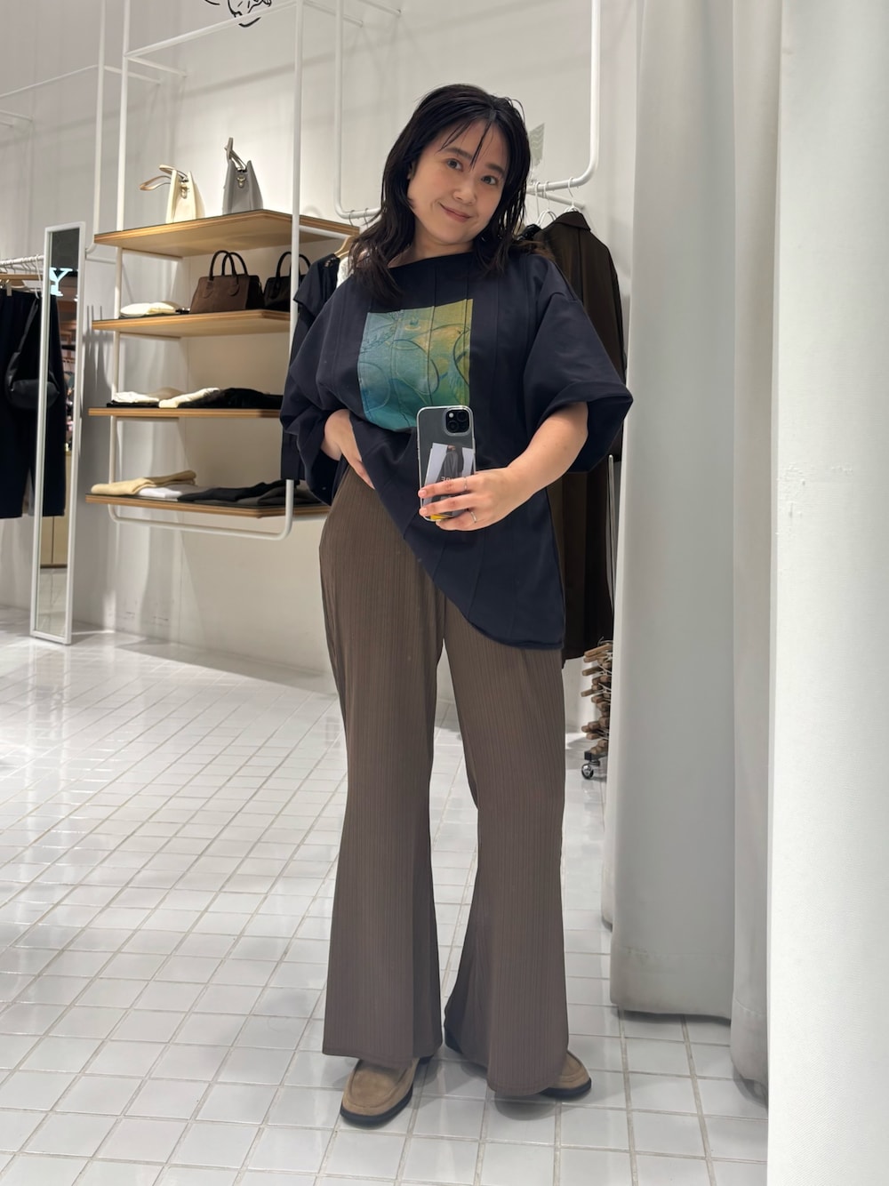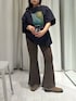 プリントのデザインが可愛い Tシャツ! Tシャツの生地は 厚すぎす、柔らかすぎずで さらっと着ると自然にクタッとなる 柔らかさがポイントです! 一生に履いた フレアパンツは膝からフレアになっていて かなり足長効果でます!