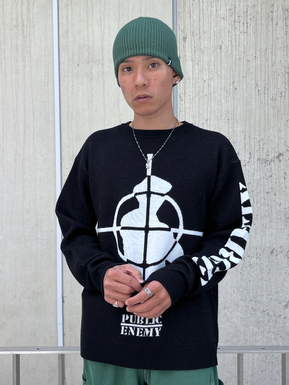 香村大貴(XLARGE原宿)のニット/セーター「XLARGE|PUBLIC ENEMY CREWNECK KNIT」を使ったコーディネート