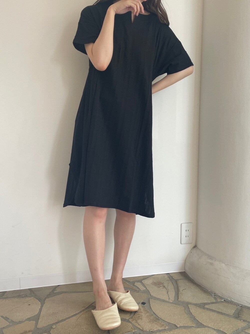 抜け感のあるスリットネックのシンプルなルームワンピ。裾サイドにもスリット入り。