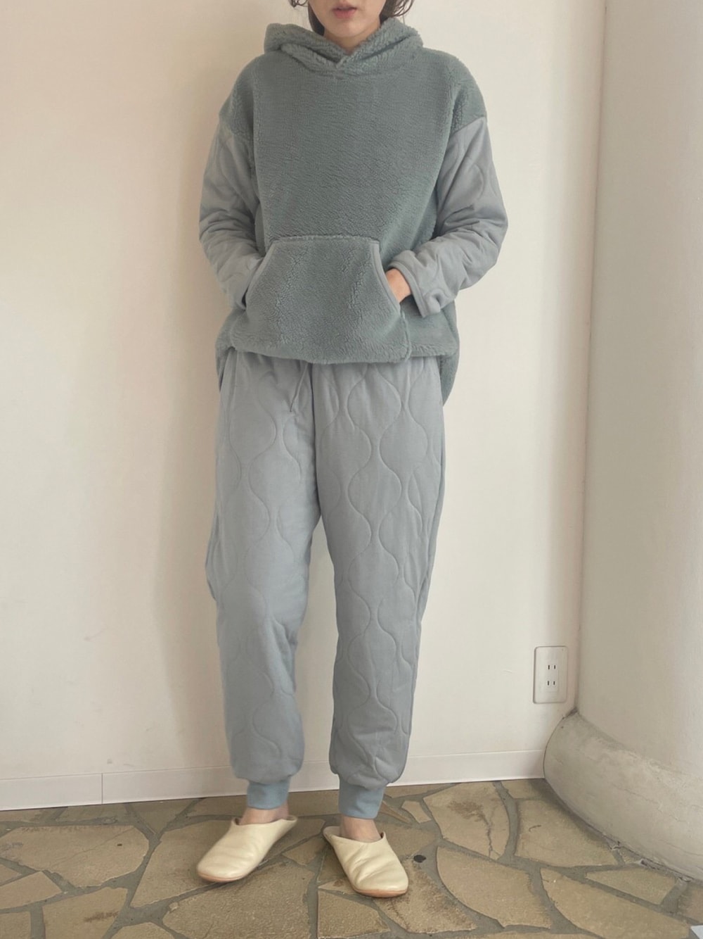 ボア素材とキルト素材を切り替えたリラクシングウェアシリーズ。ボリューミーなフーディーデザインは身頃がボア、袖がキルト素材。ボトムはオールキルト素材。くすみブルーがお洒落な色合い。