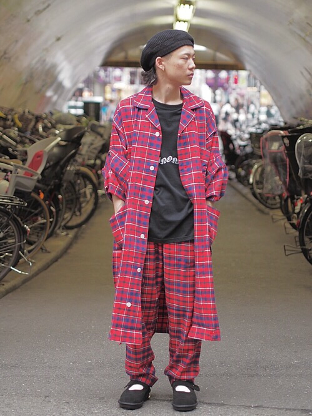 PHINGERIN【フィンガリン】定番のパジャマシリーズ、セットアップで着用。袋縫いやタグが肌に触れない設計などパジャマとしてのクオリティは勿論ですが、セディショナリーズオマージュのチェック柄がやばいです!リラックスしながら着用でき、パンク精神も感じることのできる一着!