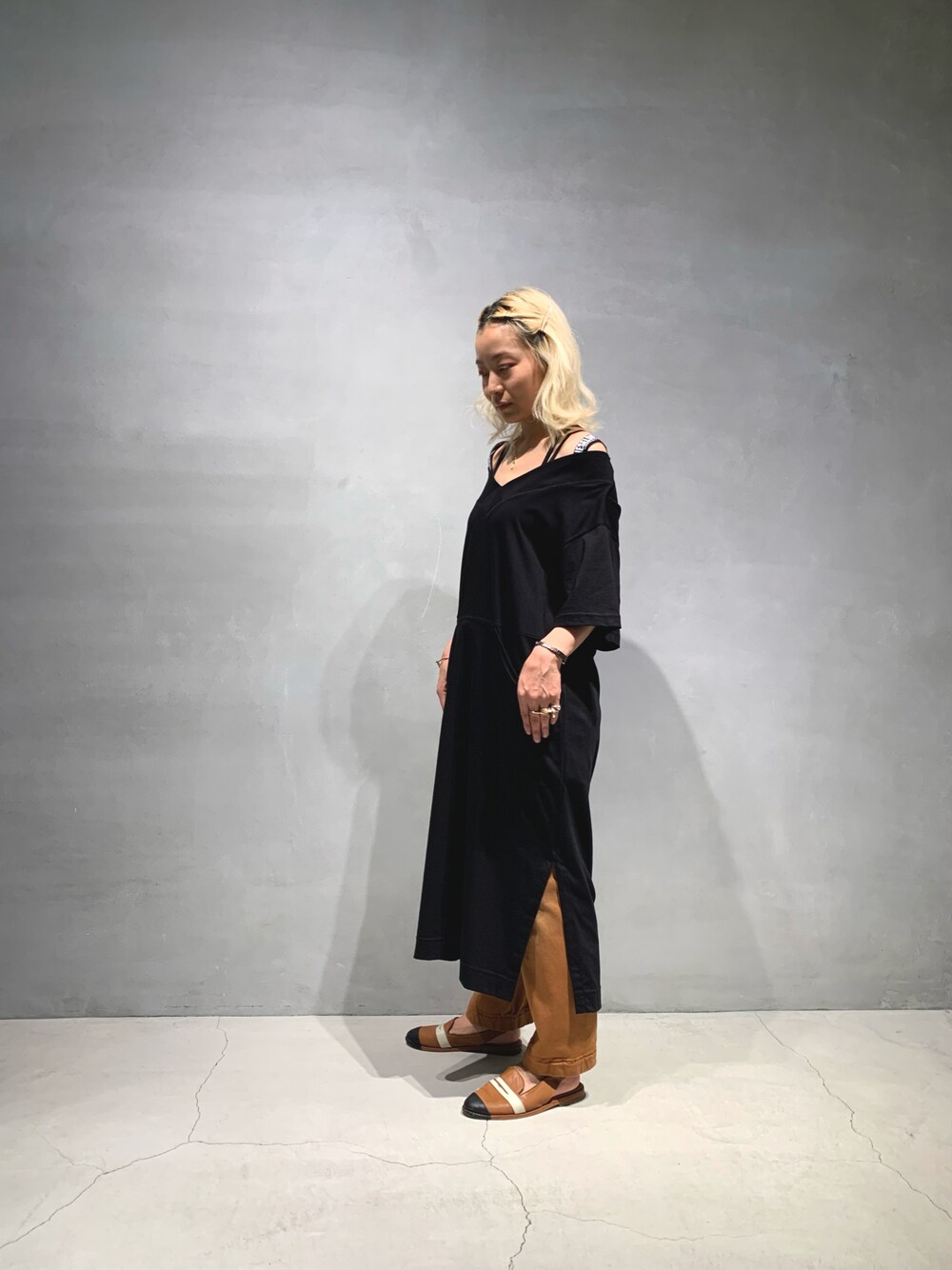 前回のカットワンピースにブラウンのカラーデニムを合わせてみました😉 ワンピースのサイドスリットからチラ見せするカラーがさりげなくて好きです❤️ こちらのデニムは裾に平ゴムのアジャスターがついているので、シルエットを楽しめます✨ 今回は、あえて裾は絞らずに合わせました!