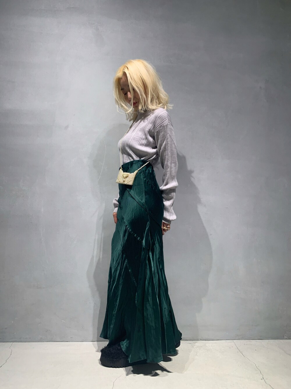 グレーのリブニットワンピースにシャイニーな素材のスカートを重ねています😉 足元は今シーズンおすすめのファーシューズで可愛さUP❣️ グレーのワンピースは、150cmの身長でマキシ丈になりますよ🌟