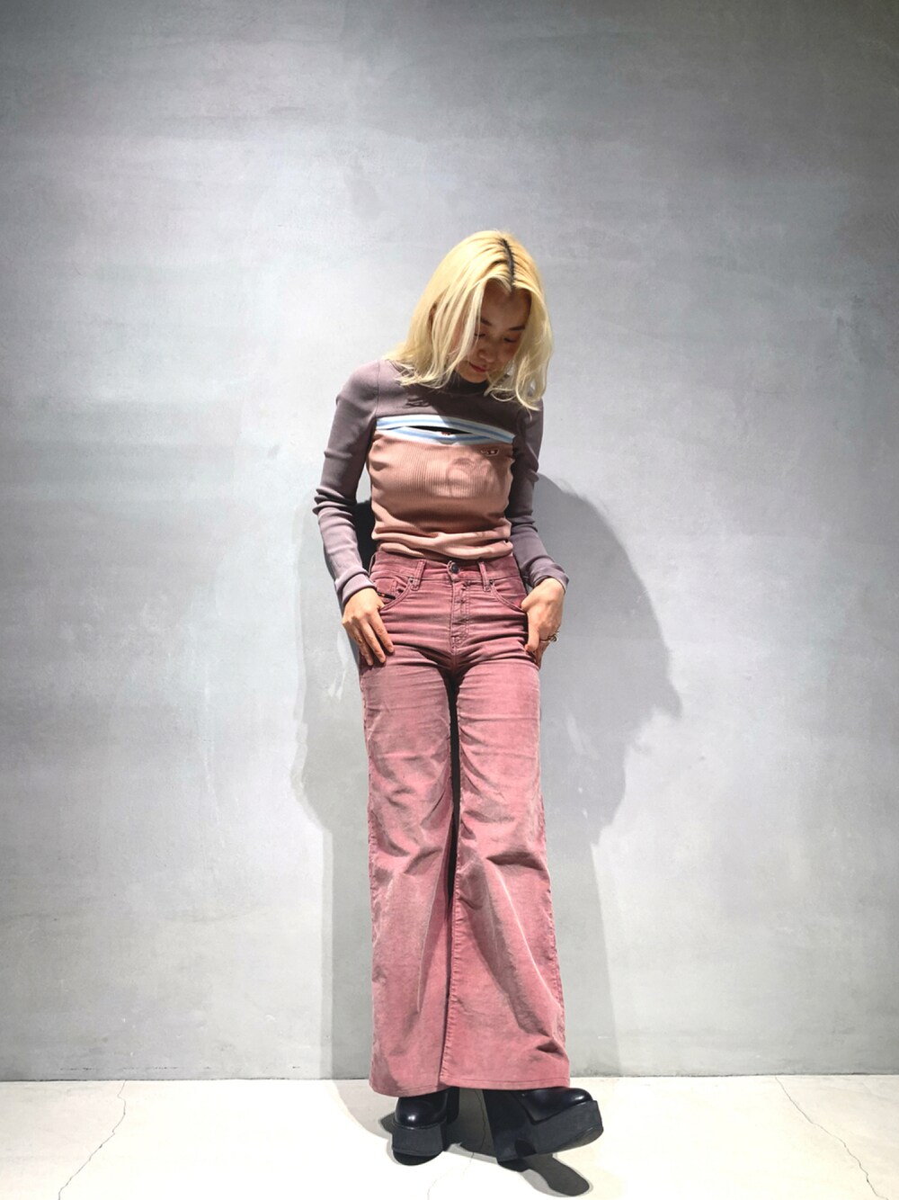 待望のグレン•マーティンスのコレクションが入荷してきました💕 褪せた色合いのピンクコーデュロイパンツと相性good😉 胸元から肌見せできるニットですが、あえて黒キャミソールのDロゴをチラ見せさせてみました😘
