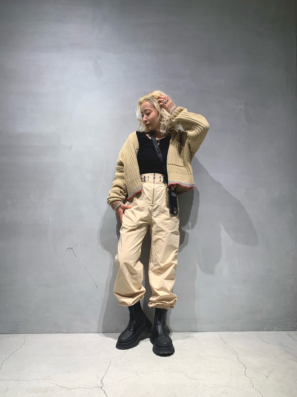 150cmの体型でもバランス良く見えるカーゴパンツ見つけちゃました😘 淡いベージュトーンもブラックのインナーとブーツで引き締めるとクールに仕上がります🌟 メイクもカーディガンのポイントカラーに使われているオレンジに合わせて🧡🧡