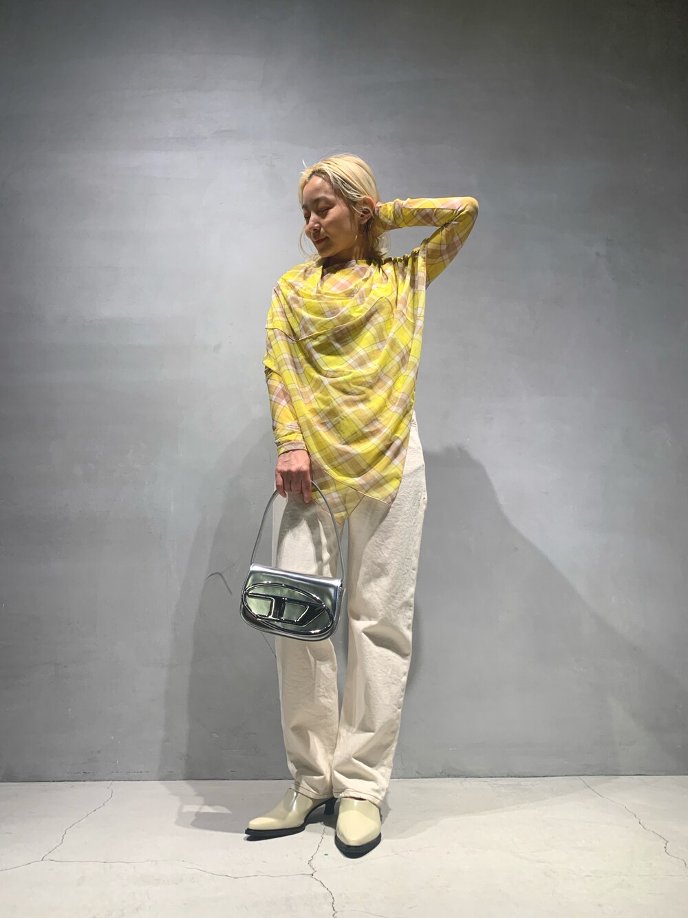 セカンドスキンの新作が入荷💕 可愛すぎるかなぁと思っていた黄色チェックのトップスに同じ生地のスカートをスカーフ風にアレンジしてみました😉 意外と透け感も落ち着いて、素敵なスタイリングになりました〜❣️