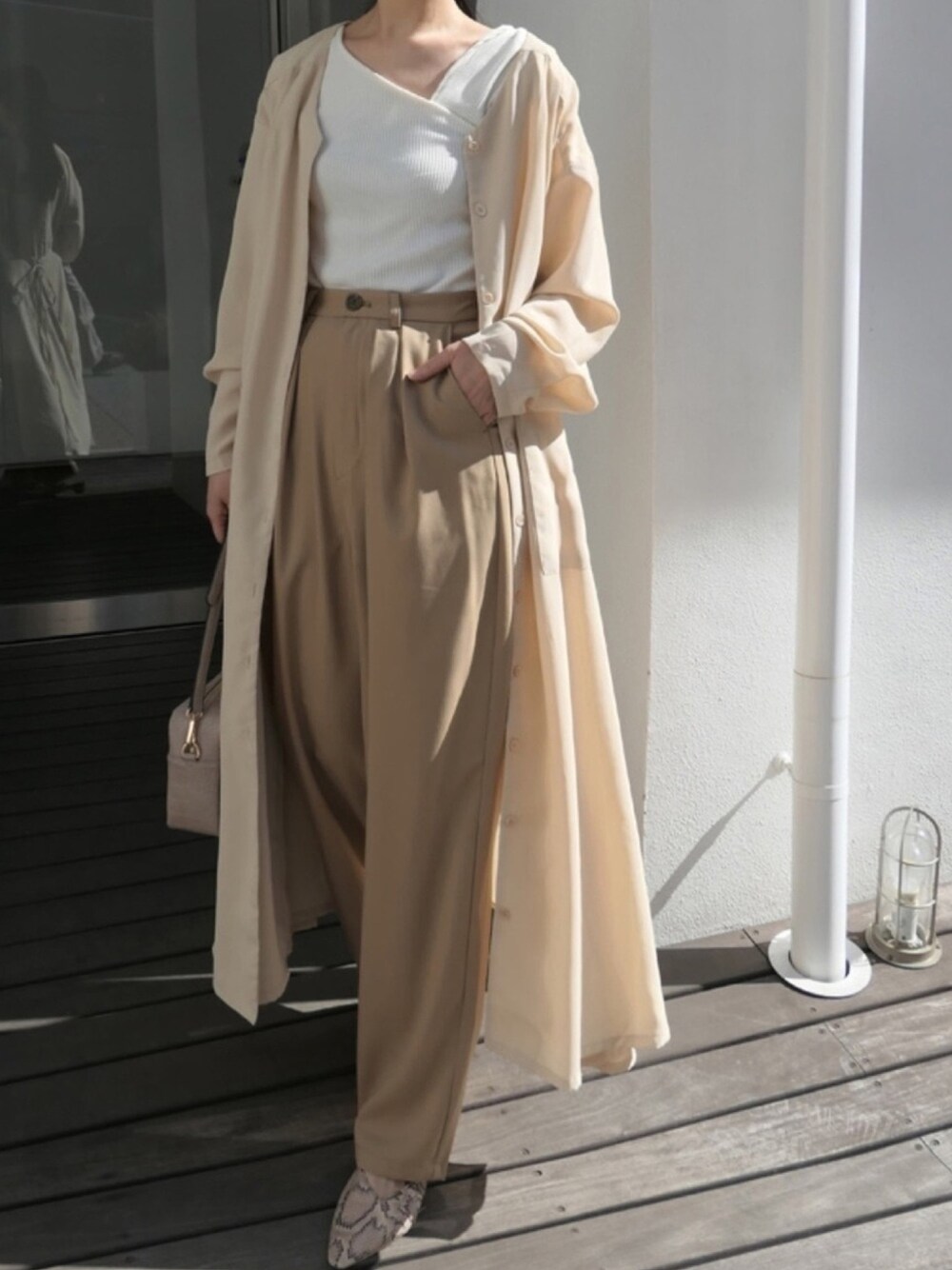 ベージュコーデ 新作ばっかり着てみた。ガウンワンピは2wayで着まわししやすいしバックデザインが可愛いから気に入った😊 インナーもアシメでタイトでいい感じ👍 パンツは履きやすいからイロチでめっちゃ持ってる。 instagram→corners.official instagram→kuririn18hao