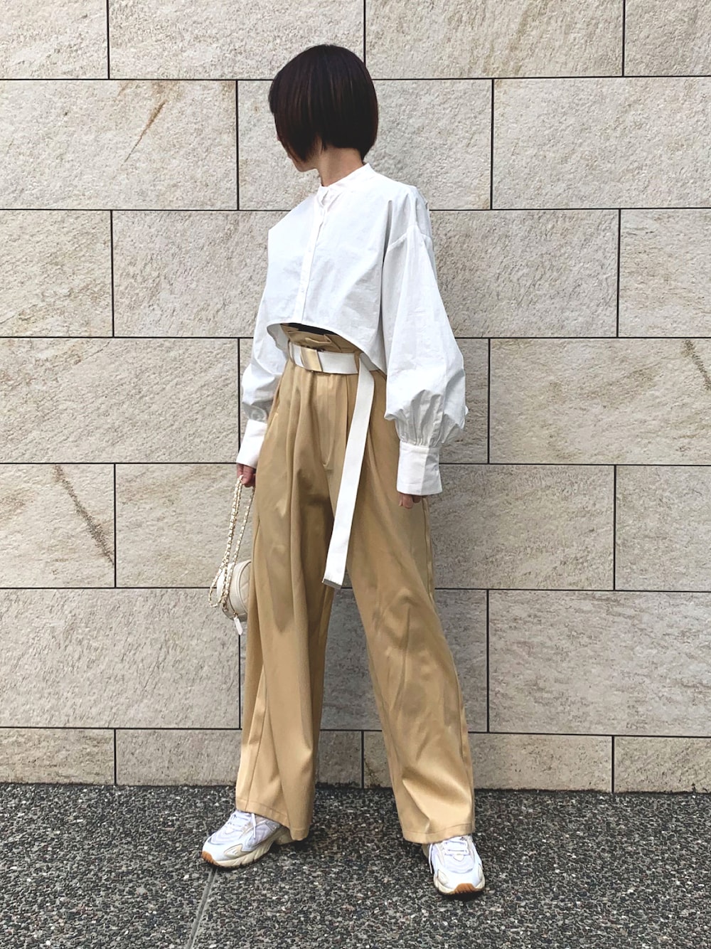 春物新作クロップドシャツ にハイウエストタックパンツ 合わせるとね脚長に見えるよ そんで なぜか仁王立ち ☺️ instagram→corners.official instagram→kuririn18hao