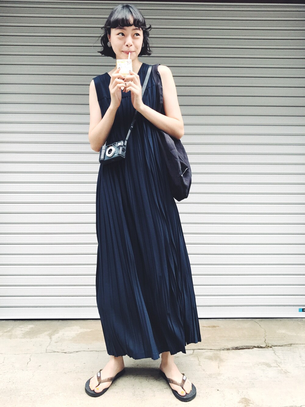 Kanocoのワンピース「Vネックプリーツロングワンピース」を使ったコーディネート