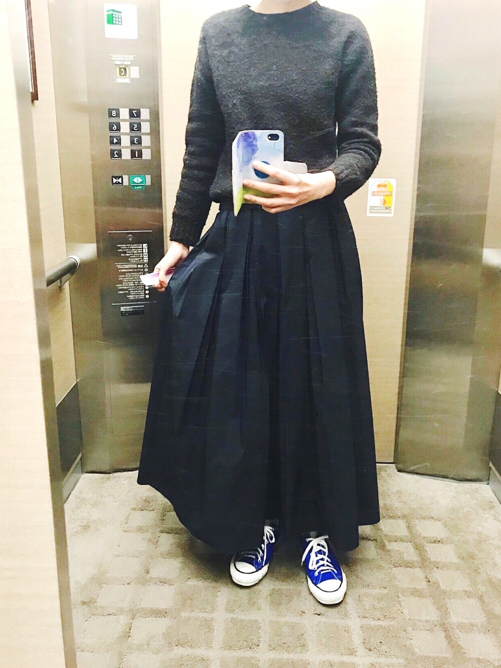 茶色のニットと、 青のスニーカーの組み合わせ。 茶×青 いいわね🐻🔵