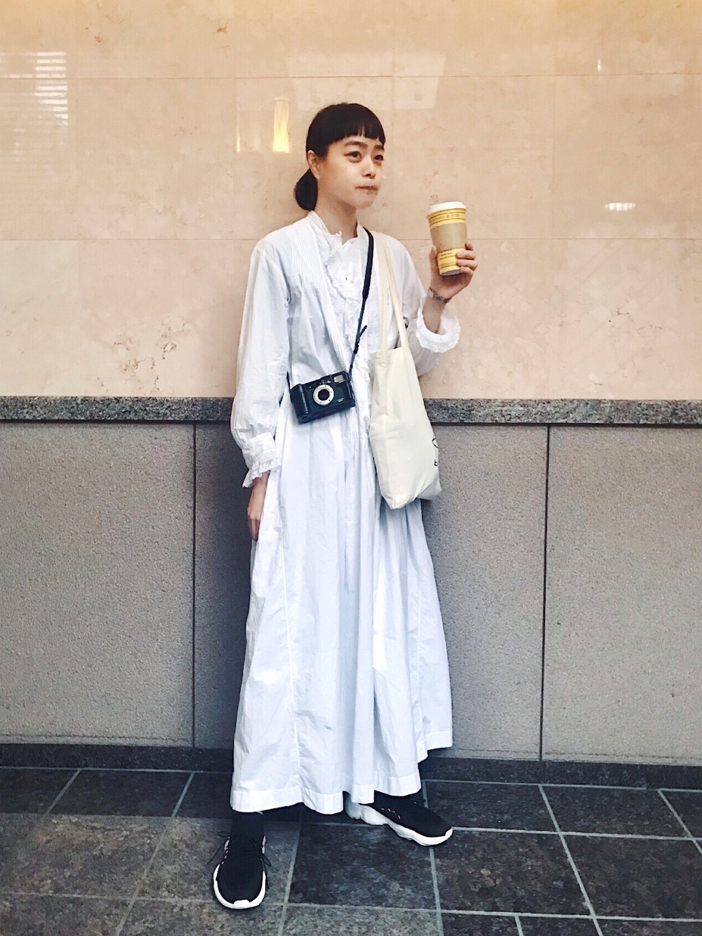 丈ピッタリな古着のワンピース。 甘めのワンピースなので、 メンズっぽいスニーカーを。