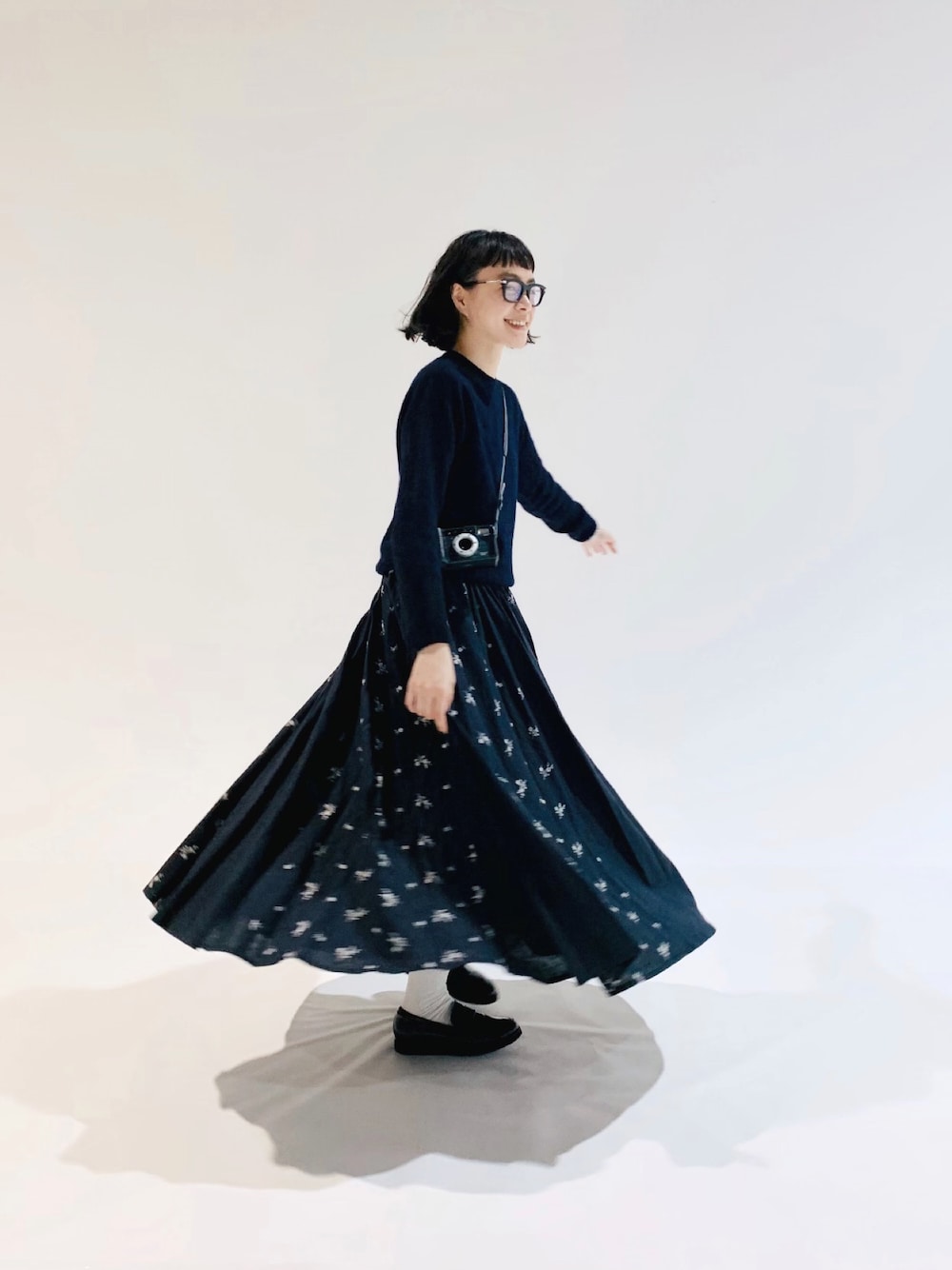 ネイビーで揃えてみました🌃 アンリアレイジのスカートは、 太陽の光を浴びると白い花柄が、 カラフルに色づきます💠 晴れの日の楽しみ。