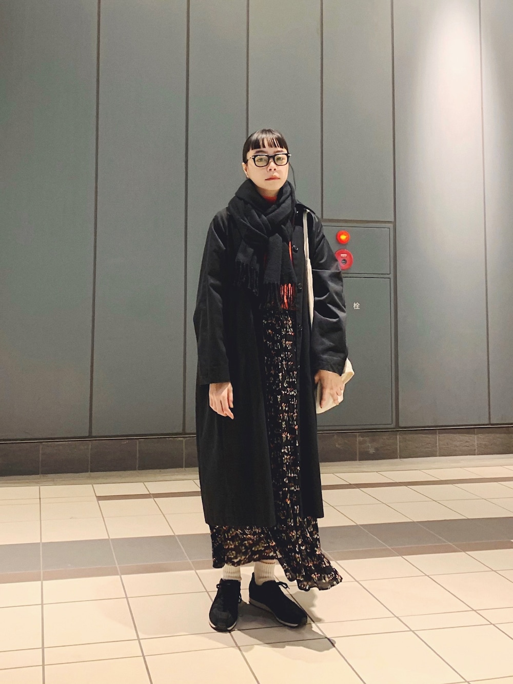 コートを抜ぐと朱色のニットに、 花柄ワンピースで春らしいの。 まだ風が冷たいね。