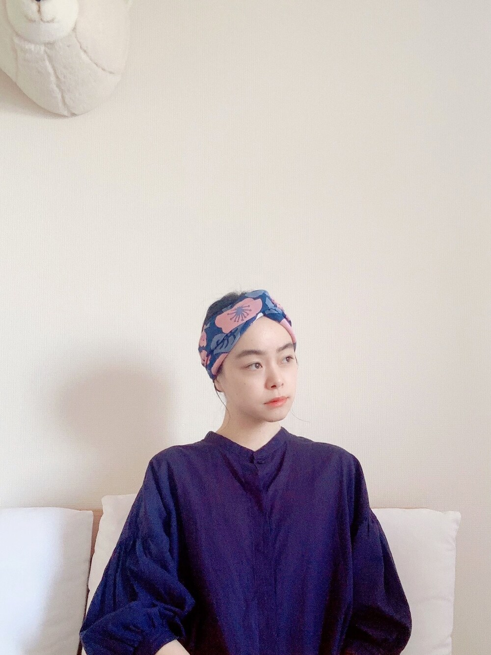 仲良しの島塚さんデザインの ハンカチスカーフ🧕🏻 二枚を結んで頭に巻きました。 青いスカーフに合わせてネイビーのワンピース。