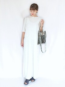 ビワコットンのワンピース涼しい〜✨ ボトムには、 ホームスパンのネイビーのパンツを。