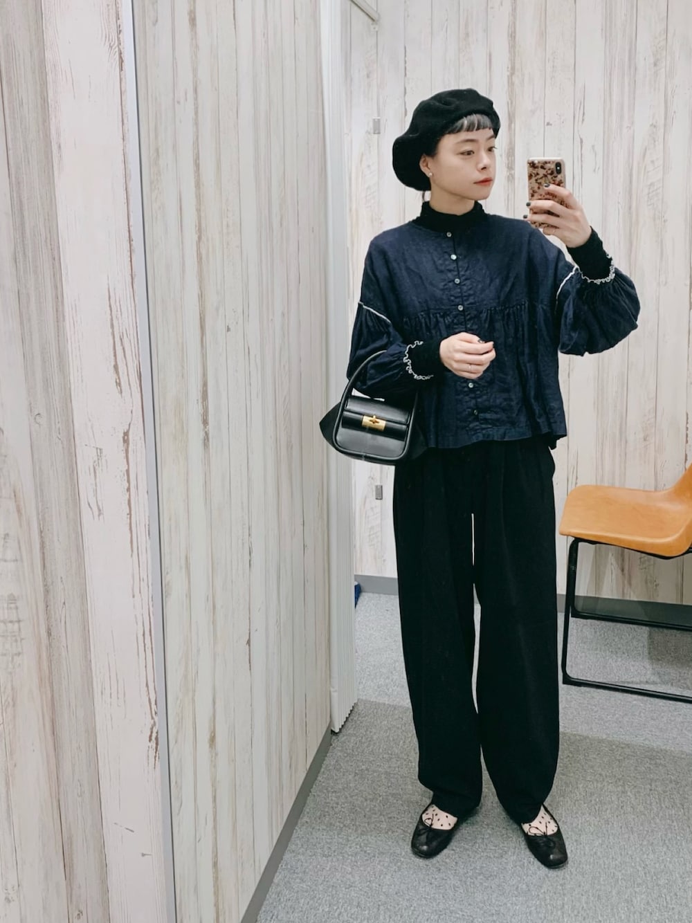 laulhereさんと一緒に作ったベレー帽、 大きめのサイズ感なので、 後ろの髪の毛すべて入れ込めるのもポイント🙋🏻♀️ nestrobeさんコラボのブラウスは、 タートル着ればまだまだこの先も着れます🍲 リネンでもクラシックな着方が出来て楽しいです。