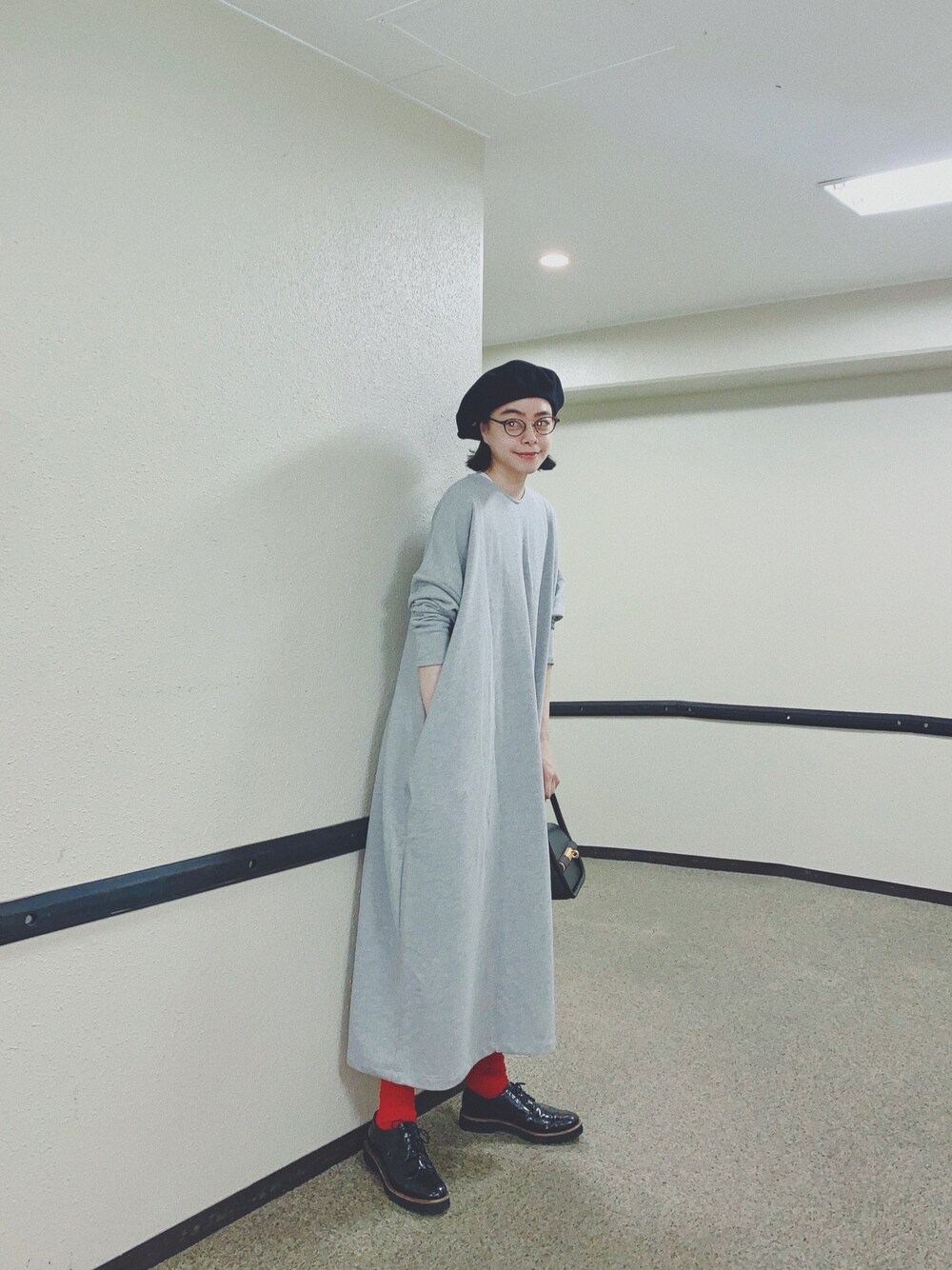 Libraのスウェットワンピース、 ゆったりで楽ちん👏なので、 小物は黒でまとめてキリッとしました。 ワンポイントに赤い靴下🧦