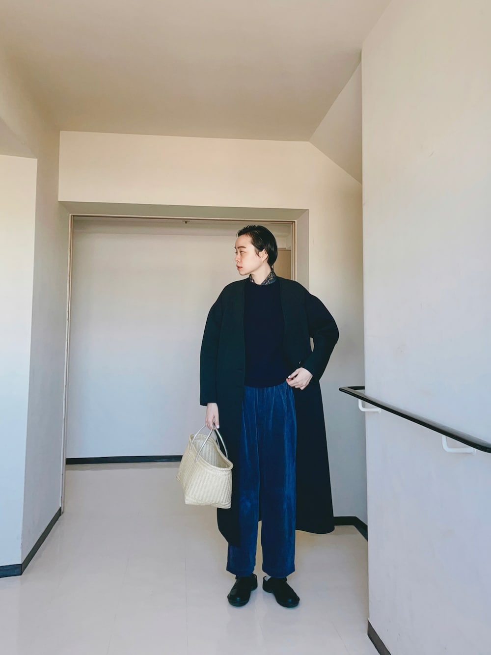 ネイビートーンの日。 首元にスカーフ巻いて、 ちょっとだけ華やかに🌷