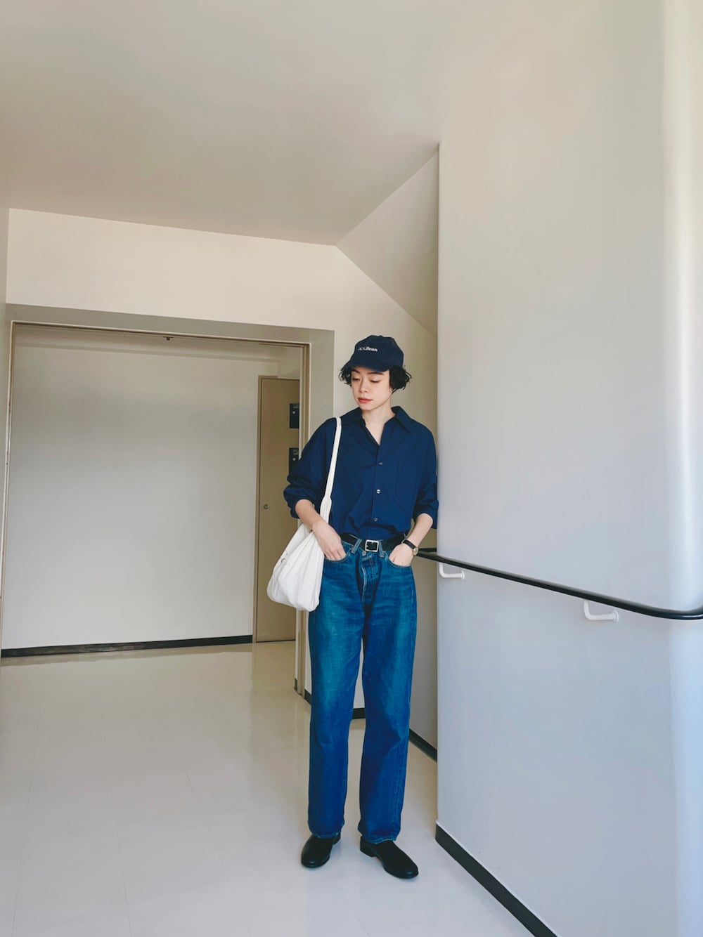 ブルートーンで合わせてみました。 オーバーサイズのシャツとデニム。 ベルトでキュッと。