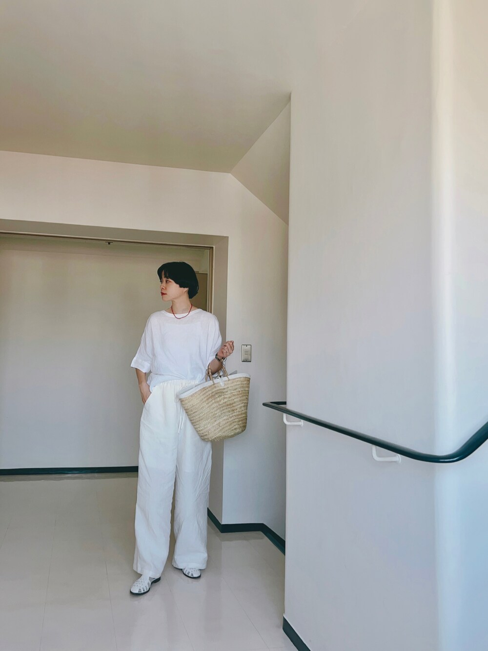 今日はものすごく暑かったので、 少しでも涼しげに見えるよう、 真っ白リネンのコーディネート🐻❄️ アクセントに赤いネックレスを🍎