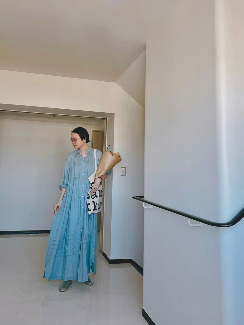 Kanocoのシャツワンピース「ラミーワッシャータックディテールワンピース」を使ったコーディネート