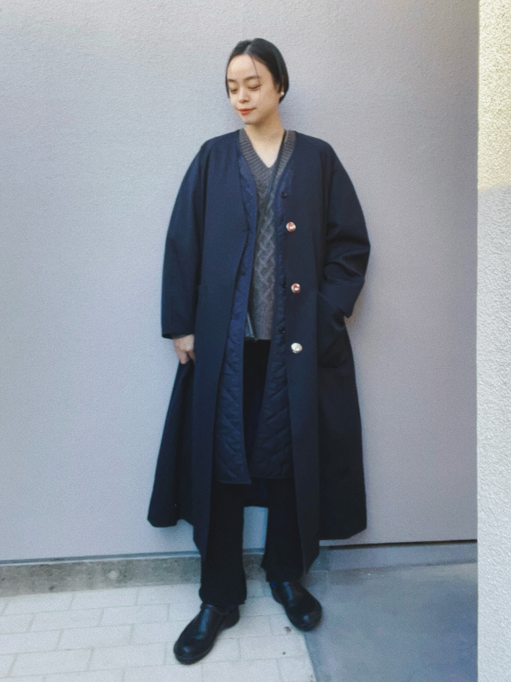 Caccoのコート、 肉厚なニットも袖にスッと入るので楽ちん👍 そろそろストールぐるぐる巻きたいけど、 また日中はポカポカでいらなそう🤔