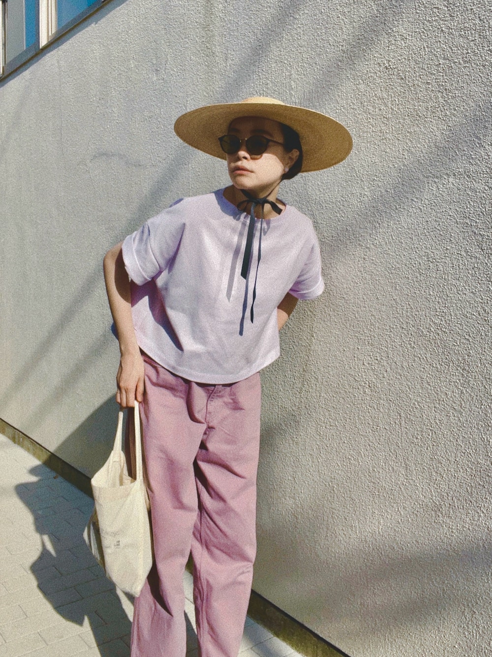 Caccoの新作、 ショート丈ワイドTシャツ ラベンダーです🪻 同系色のUNIQLOパンツと合わせました。 日差しが強くて、 駅の売店みたいなところで サングラス買っちゃいました😂 意外と使いやすくて良いです👏