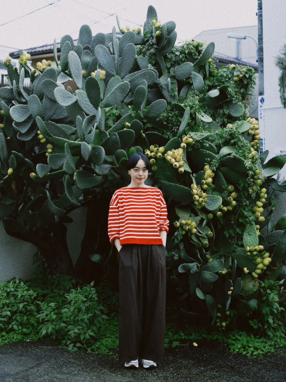 撮影終わりにサボテンの前で🌵 灼熱のような季節も終わり、 少しずつ秋になってきました。 Cacco赤ボーダーと、 スタイリストの佐藤かなさんコラボの パンツを合わせてみました🤎 秋はお洒落が楽しめるので、 大好きです。