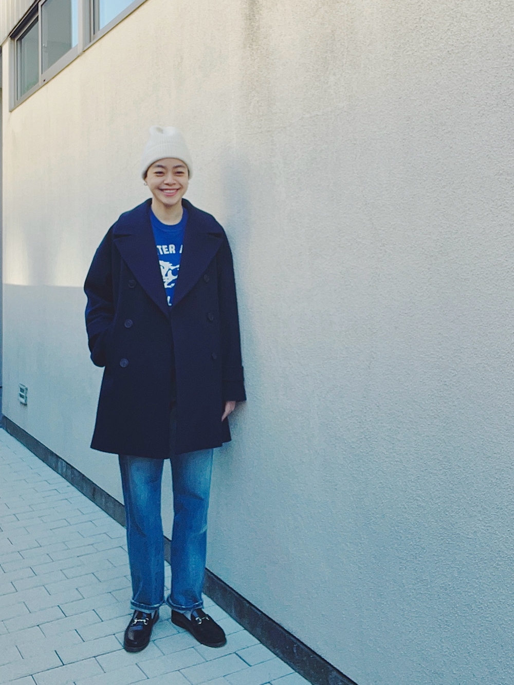ネイビーのコート、 とっても使いやすくて、 毎日のように着ています。 青×茶色が好きなので、 茶色のローファーで👞