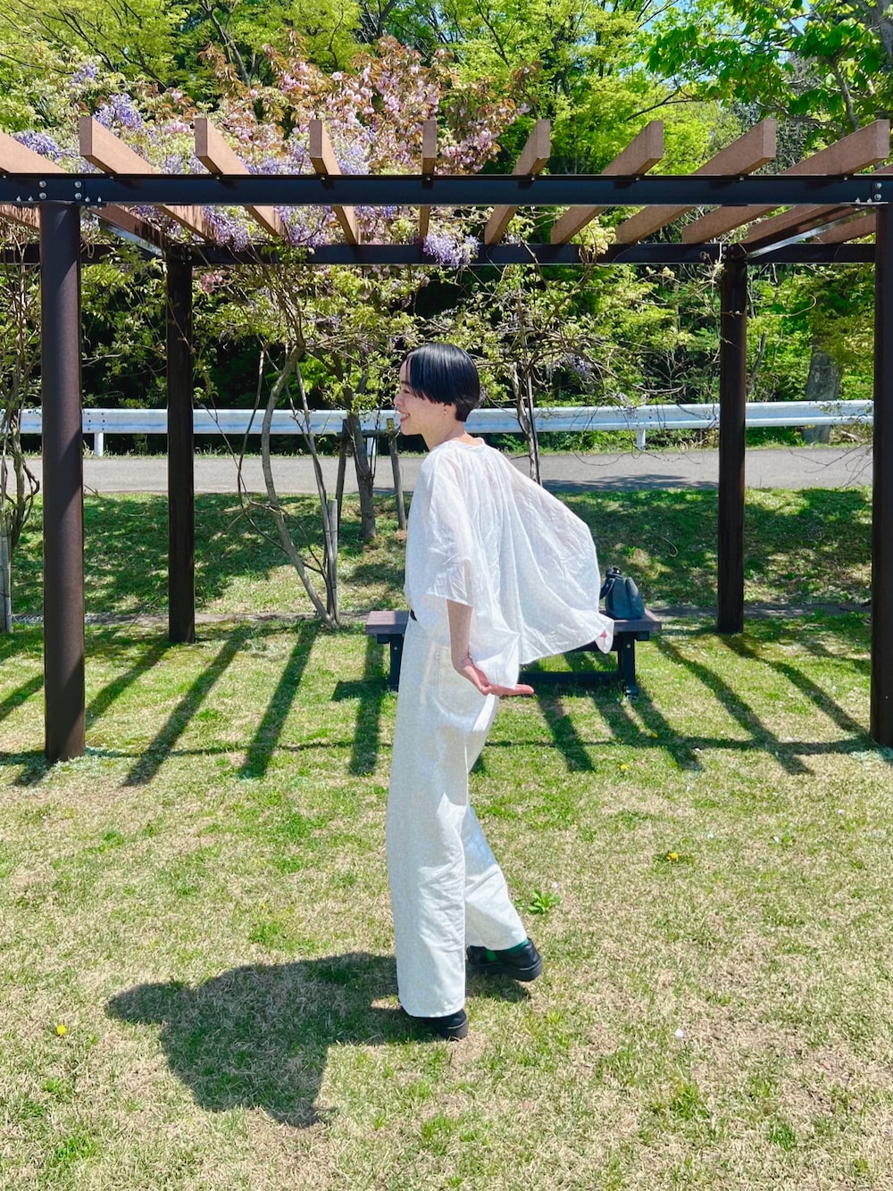ブラウスの白を着てみました🦢 こだわりの生地の柔らかさ、軽やかさ、 写真でも伝わってると嬉しいです。 白デニムを合わせて真っ白コーデに。 ボタンの黒と合わせて、 小物は黒を選びました🐈⬛ 分かりにくいですが、靴下に緑を🟢