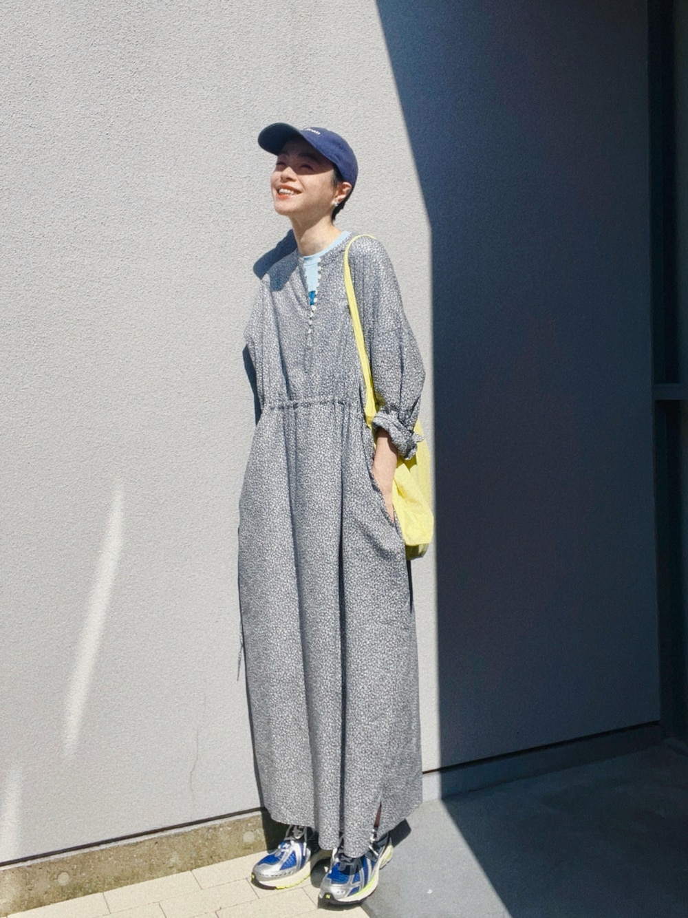 新作のワンピース、 青系の花柄を着ました🩵 ガーリーナチュラルに着ても良し、 Tシャツ、キャップ、スニーカー合わせて、 カジュアルに着ても良し◎ 派手な花柄じゃないので、 大人も着れる花柄です🪻 ぜひほぼ日さんより、 ご覧ください♡