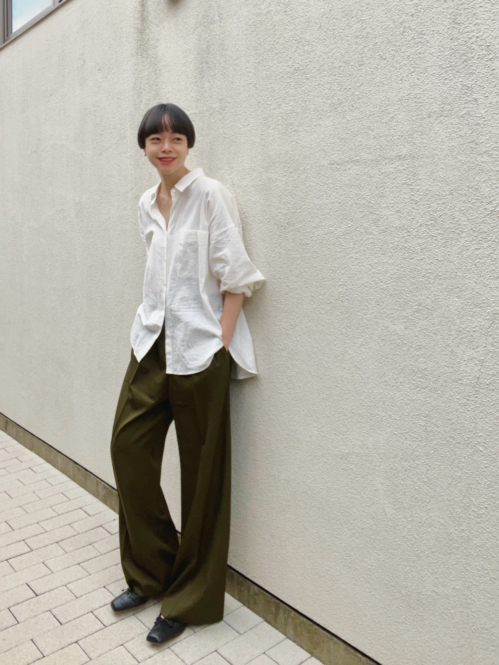 真夏にもこの白シャツ、 よく着ていましたが、 9月の今はカーキのパンツと、 バレエシューズを合わせて、 少し秋らしく🍂 合わせによって、まだまだ着られそう🌕