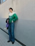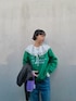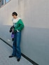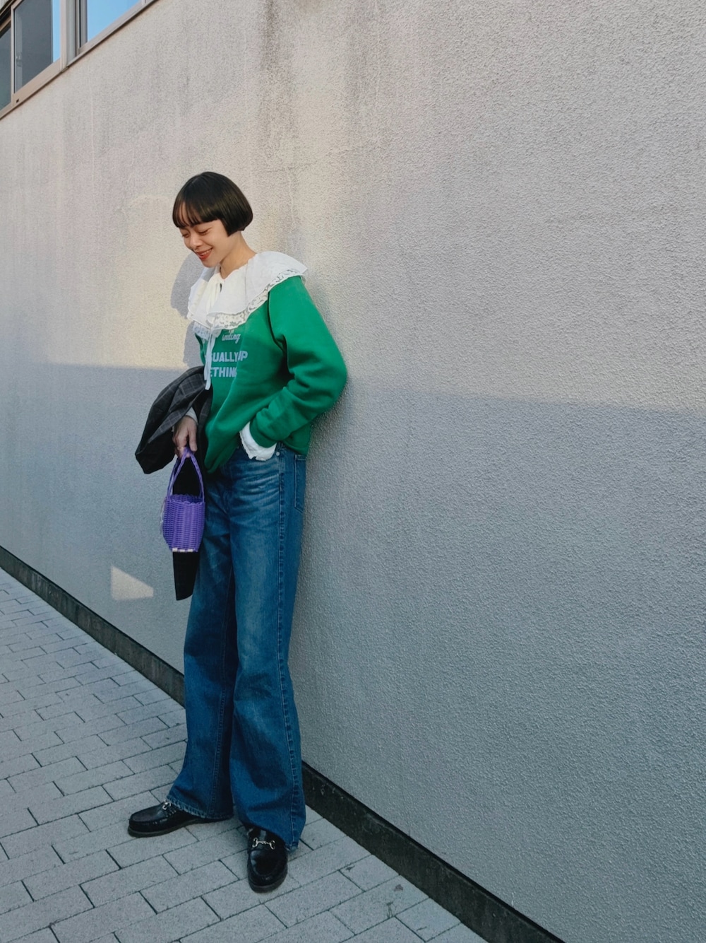 古着のスウェット💚 完売していますが、 リブラコラボのブラウスの襟を出して。 紫のバッグに合わせて、 マルコモンドさんコラボの靴下を。 (こちらはほぼ日さんで発売中🧦) 仕事行く時はトレンチ着てましたが、 お迎えの時はジャケットに変更。
