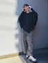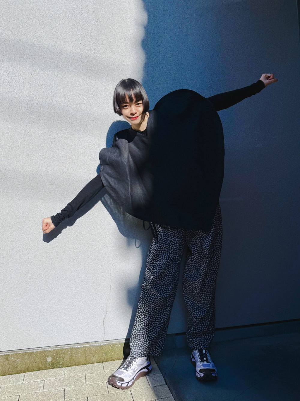 WANDMEEのハートのトップス🖤 長男指示の謎ポーズで。 ハート着てると子供達から人気です👏