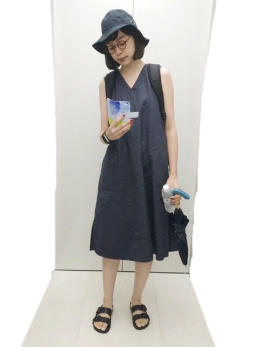 ネイビーのワンピースに MHLのネイビーの帽子が よく合います。