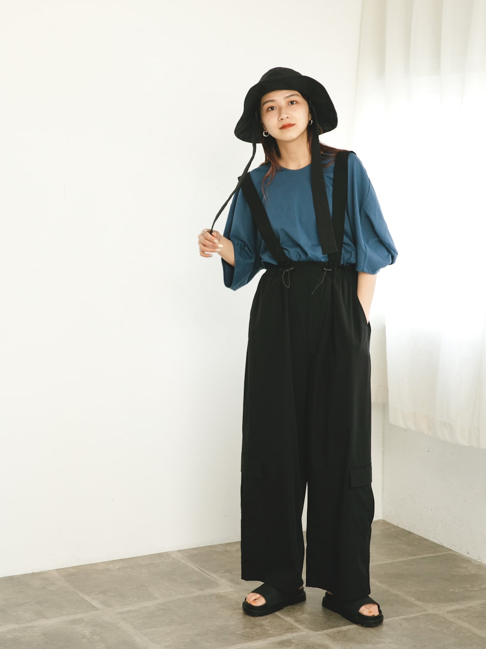着回し力抜群のサロペットをご紹介◎ サスペンダーデザインなのでボリューム袖のインナーとも相性抜群! ハットを合わせてカジュアルに仕上げました◎