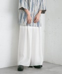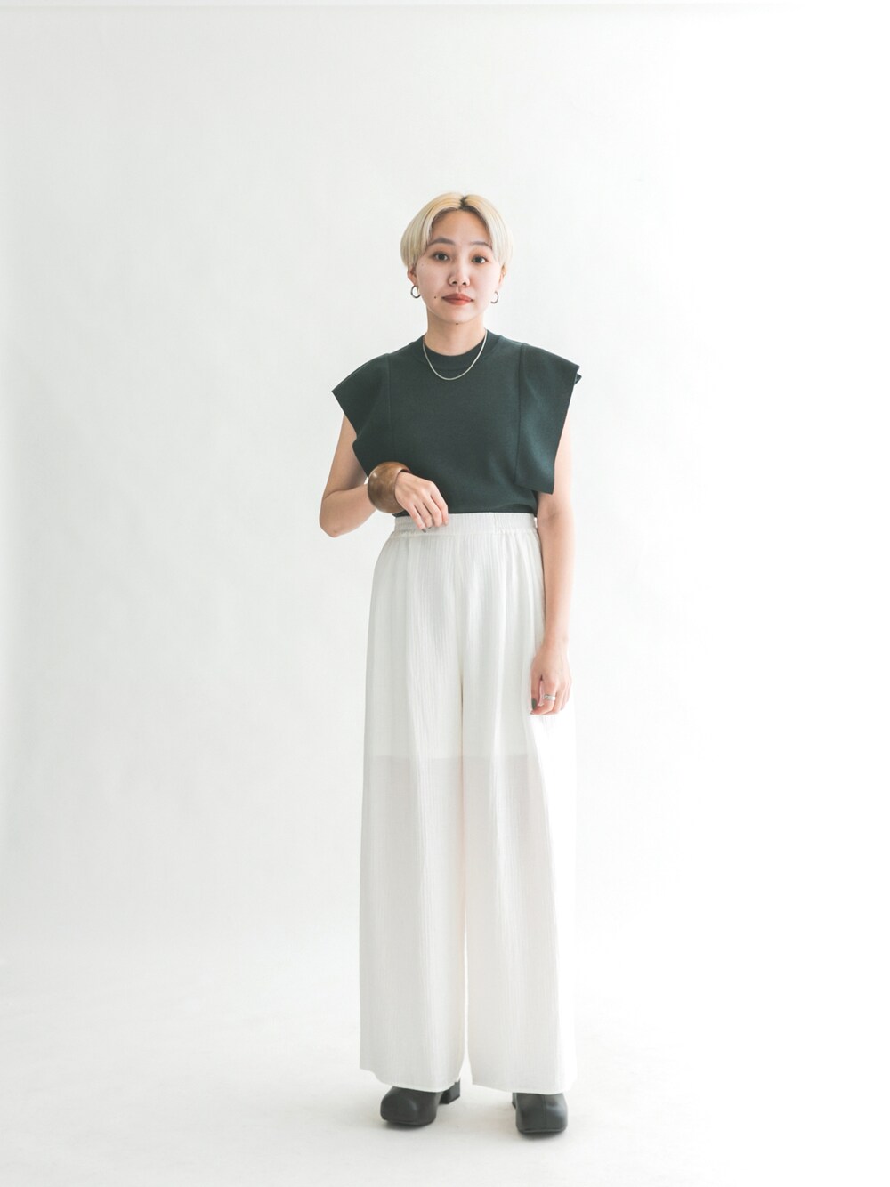 大人っぽいデザインのニットに ワイドシルエットのイージーパンツを合わせてラフな印象に。