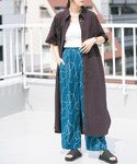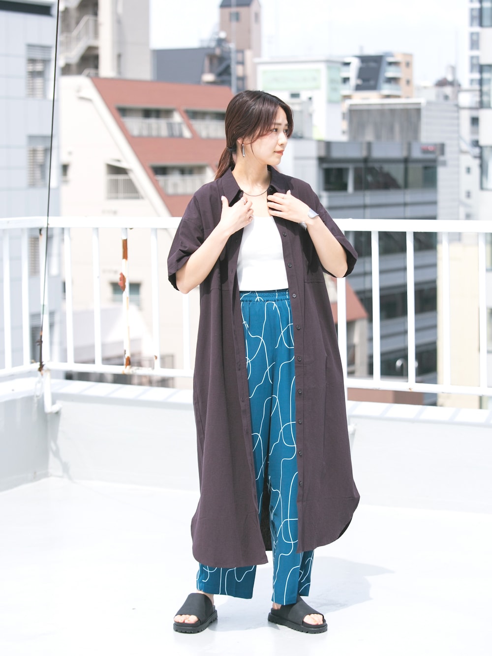 羽織としても重宝するシャツワンピ。 落ち着いた色味なので、ブルーのパンツとも好相性です◎