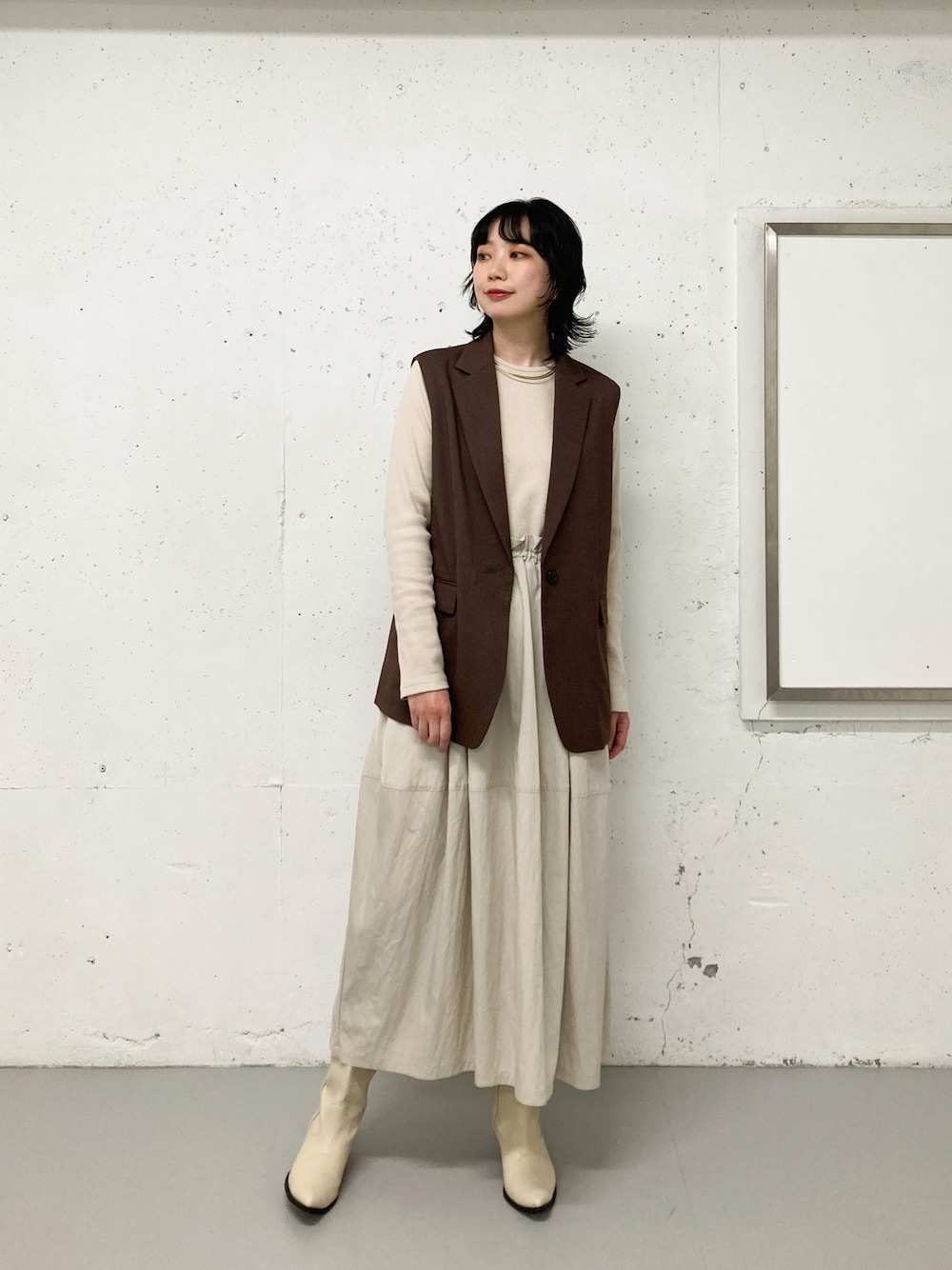 ウエストデザインが目を惹くワンピースは 167㎝の私が着てこの丈感なので、高身長の方にもおすすめ! 小柄な方はドローコードをぎゅっと絞り、ブラウジングしていただくのが良さそうです◎ ベストを合わせて少し大人っぽい印象に仕上げました。