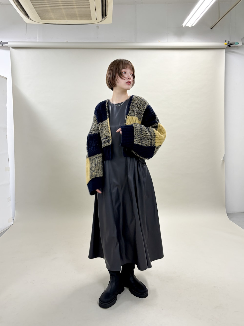 1枚で華やかに決まるチェック柄カーディガン フェイクレザーのジャンパースカートに合わせ大人っぽいコーデに。 ショート丈なので、ワンピに合わせてもダボっとして見えないのがポイント〇