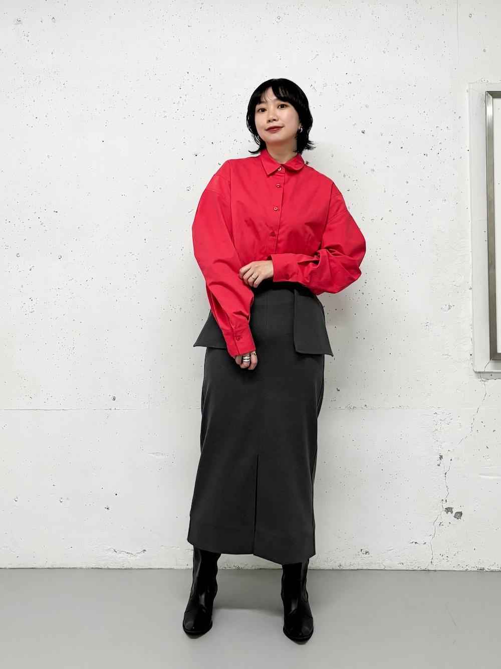 トレンドのクロップドシャツ。 着るとテンションの上がるパキッとカラーが可愛いです! カジュアルになり過ぎないようタイトスカート&ブーツを合わせました。 スカートの特徴的なポケットデザインにも注目です◎