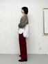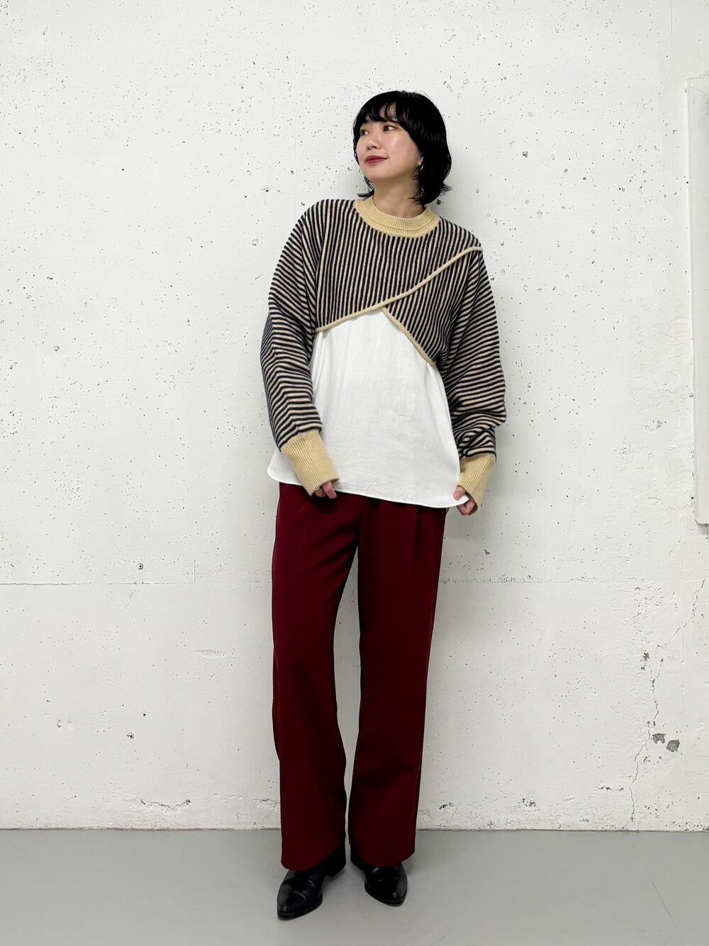 クロップド丈のニットは前後2WAYで着用可能。 シンプルなワンピースなどに重ねても可愛いと思います! 中に着たかぐれのシャツは1枚着のみならず こういったひと癖あるアイテムとのレイヤードにも重宝するので便利ですよ◎ パンツ、シューズは私物です。