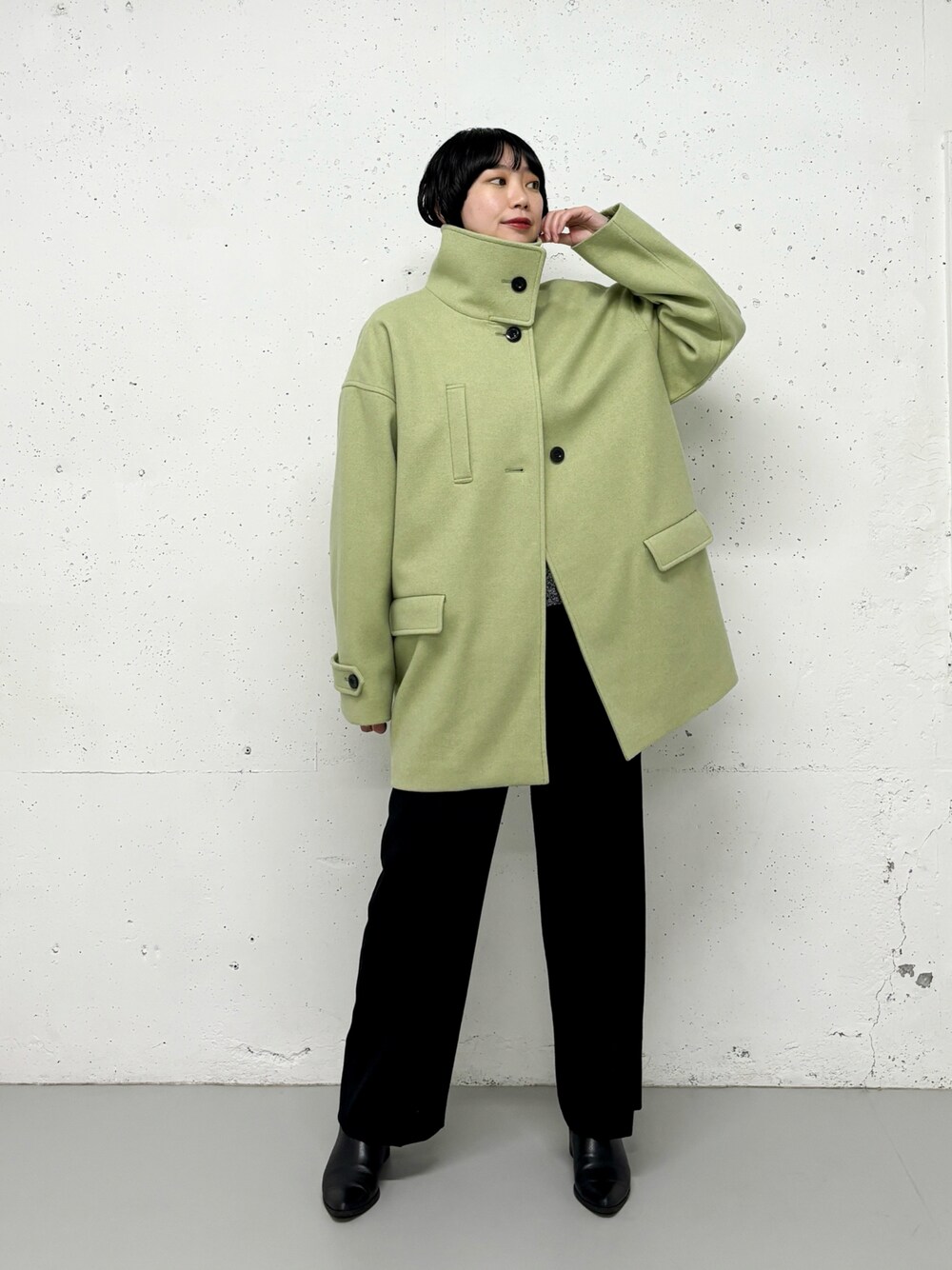 着ていてテンションの上がるピスタチオカラーのコート。 スタンドカラーで楽しんでも、折り返してビックカラー風にしても良し。色々楽しめそうです。 ニットとパンツはモノトーンでまとめてバランスを取りました。 ニットは軽くて着心地◎ パンツはオールゴムで、167センチでこの長さ。 今回はブーツを合わせましたが、スニーカー合わせでもバランス良く穿いていただけます!